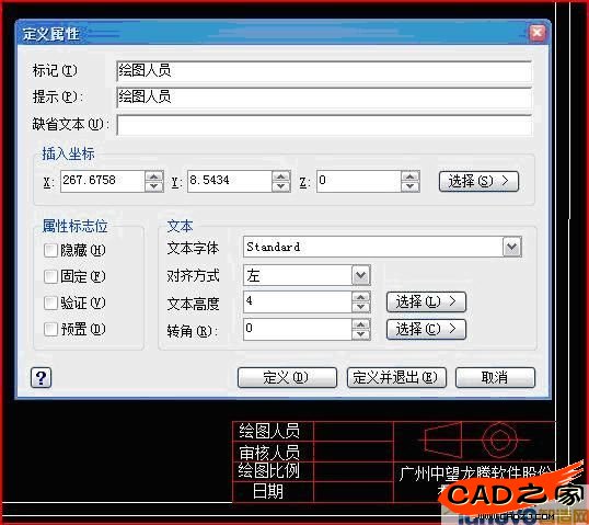 如圖3所示,要對繪圖人員這一項進行屬性定義。我們需要輸入命令att以調出定義屬性對話框,再將對話框中的標記和提示填寫成繪圖人員,將提示刪除或寫入我們需要提示的內容,然后點擊選擇。