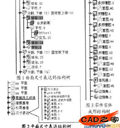 所有零件內(nèi)、外形線均由Splitting生成。每個"分割線"由3個子操作組成(被分割的線、用來切割起始端的線、用來切割終端的線),操作均用右鍵方式以保證子操作集成于父操作下。同理,"被分割的線"、"用來切割起始端的線"和"用來切割終端的線"如果有子操作也用右鍵方式以保證子操作集成于父操作下。圖1是尺寸表達(dá)的結(jié)構(gòu)樹。