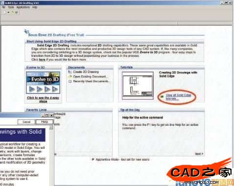 Solid Edge 2D 制圖提供有簡明教程,可以幫助新用戶快速學會使用該產品。運行Solid Edge 2D 制圖后, 單擊“ 查看所有SolidEdge 教程”。請參見右側圖片。圖中圓圈所示為教程主題。此圖顯示的是Solid Edge 教程對話框。單擊“工程圖教程”下面的“使用Solid Edge 創建2D 圖形”。此操作將運行該教程。按照教程中的步驟進行操作。然后可以返回到此對話框,運行其他教程。