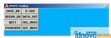 首先,利用APDL語言在ANSYS的工具條(Toolbar)中,建立了三個選項按鈕,分別是“DATA_OUT”、“CAL_MASS”和“GET_MASS”,見圖1。它們分別對應的功能是: