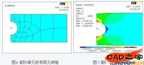 圖6中的有限元模型采用了8節點的單元,圖2中的單元采用了4節點的單元,從其計算結果中可以看出,高階單元在應力集中處即使較粗糙的網格劃分,也可以計算得到較精確的應力值。因此,在有應力集中和剛度突變的地方,應該采用高階單元來對其進行網格劃分。