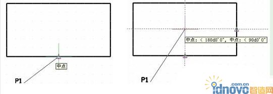 1)此時我們以中點捕捉在下邊的中點處停留數秒,如圖4,不必點取,以取得第一個追蹤點,顯示為一個小三角形標志(中點),并引出垂直對齊線。