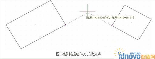 分析解決:對象捕捉設置中鉤選延伸方式,鍵入Line命令或者單擊圖標 ,鼠標移動到左邊矩形的右下角,再慢慢往右上方移動,出現一條延伸線,再將鼠標移動到右邊矩形的左下角,同理,慢慢往左上方移動也出現一條延伸線,當到達某一位置時,兩條延伸線相交,這也正是我們要找的點,點擊鼠標左鍵確定。