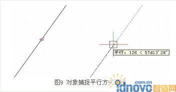 分析解決:對象捕捉設置中鉤選平行方式,鍵入Line命令或者單擊圖標 ,點擊已知點作為直線L2的起點,鼠標移動到直線L1上晃動一下,在直線L1上出現一個小的平行圖標,鼠標右移,從已知點出現一條對象捕捉虛線(平行對齊線),如圖9所示,沿此對齊線就可作出要求平行的直線L2。