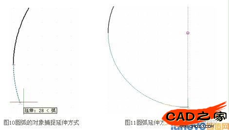對象捕捉追蹤應用是廣泛的,只是一些人沒有利用起來,對象捕捉與對象捕捉追蹤結合使用,更能體會到其優越性。圖10是利用對象捕捉的延伸線來進行圓弧的延伸方式捕捉,圖11則是圓弧延伸方式與過圓心極軸相交。中望CAD2006的延伸捕捉、平行捕捉和捕捉自功能都能與自動追蹤系統相輔相成,為我們提供了強大的捕捉、追蹤系統。
