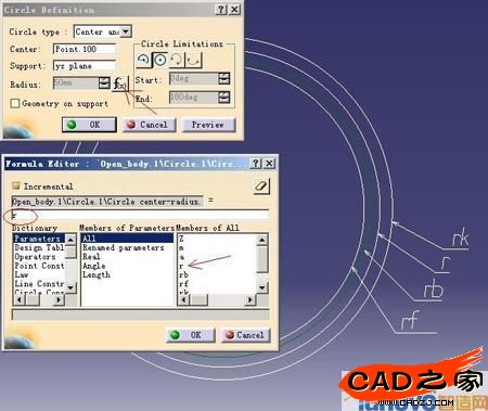 用前面定義的parameter,畫(huà)出齒頂圓,分度圓,基圓和齒根圓,作為下一步的參考