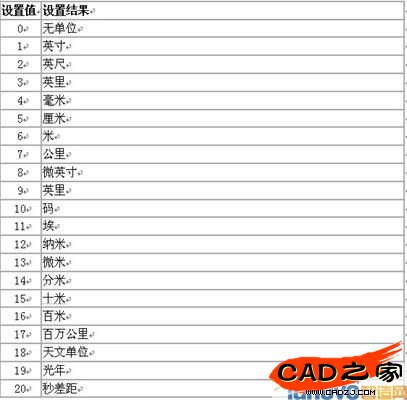 三.Insunits,此變量用來指定從設計中心將塊或圖像拖入到圖形中自動縮放的圖形單位值。常用到的為圖紙的公英制切換。它的設置值如下: