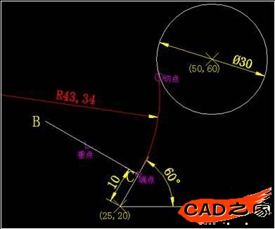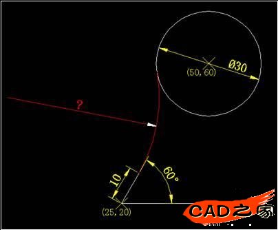下面我們來(lái)看一道例題,通過(guò)這道例題來(lái)熟練掌握中望 CAD 2009在三點(diǎn)畫圓法中的垂點(diǎn)應(yīng)用。例題為:根據(jù)已知條件求紅色圓弧的半徑。