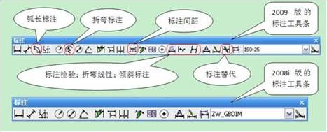 從下圖可以看到:中望2009版本和2008i版本之間的標(biāo)注功能對(duì)比,在2009版本里面,標(biāo)注工具條相對(duì)于2008i版本新增了弧長(zhǎng)標(biāo)注、折彎標(biāo)注、標(biāo)注間距、檢驗(yàn)、折彎線性、傾斜、替代等功能按鈕。