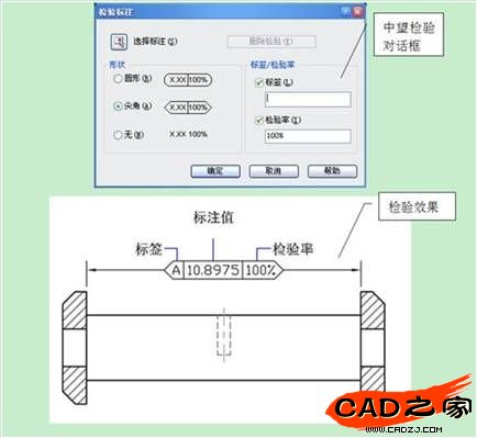 可以將檢驗(yàn)標(biāo)注添加到任何類型的標(biāo)注對(duì)象;檢驗(yàn)標(biāo)注由邊框和文字值組成。檢驗(yàn)標(biāo)注的邊框由兩條平行線組成,末端呈圓形或方形。文字值用垂直線隔開(kāi)。檢驗(yàn)標(biāo)注最多可以包含三種不同的信息字段:檢驗(yàn)標(biāo)簽、標(biāo)注值和檢驗(yàn)率。