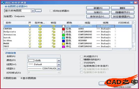 打開軟件,我們可以在整個界面的上方看到圖層的工具條,我們點擊圖層特性管理器按鈕,進入軟件的圖層管理器界面。在這個界面中,我們可以進行圖層名稱,顏色,線寬等各個樣式的設置。如圖1