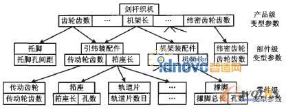 劍桿織機產品的參數傳遞結構如圖6所示。每一個產品級變型參數都會形成一棵參數傳遞樹,而一個復雜產品往往包含多個產品級變型參數,因此其參數傳遞結構往往是幾棵參數傳遞樹交錯重疊在一起的。