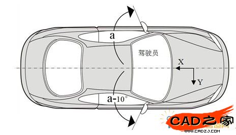 汽車后視鏡作為汽車的一個非常重要的安全部件之一,國內外對汽車后視鏡都有強制的國家標準,特別是對后視鏡的視野要求,其設計顯得非常重要。由于駕駛員的眼睛分別離左右兩個后視鏡的距離不一樣,為保證汽車后視鏡滿足視野要求,鏡片與車身X軸所調整的夾角就不一致,遠離駕駛員一側的后視鏡與車身夾角更小,相差角度約10°。