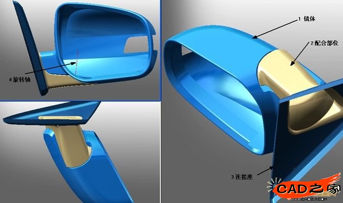 2. 根據左邊后視鏡外形數據找出后視鏡的折疊旋轉軸線,將后視鏡的外形分割為連接座、鏡體兩部分;