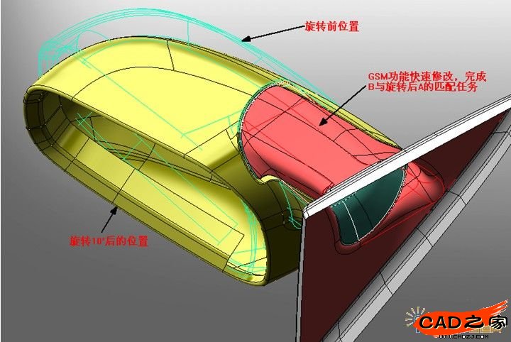 6. 將連接座與鏡體的配合部位分為A和B兩個部分,由于A與鏡體有配合要求,所以把A也繞旋轉軸線向車身后旋轉約10°,結果見圖5。在圖6中我們可以看到A旋轉后,B需要與之匹配,才能滿足配合部位的設計需求。