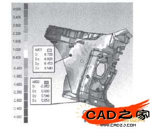 通過3D比較,可以獲得零件的整體回彈量,得出一個全面、直觀、形象的回彈檢測結果。在完成對齊操作后,進行3D比較,比較的結果如圖3所示。從顏色與對應的數值可以反映出零件的整體回彈變形情況。各處的向彈量的具體數值可利用“創建注釋”操作得出。此外,根據比較結果還可自動統計出最大偏差、最小偏差、正負偏差和標準偏差,數值分別為4.64mm,一4.923 mm,1.065mm,一1.237 mm,和1.412mm。