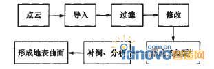 通常情況下,測繪部門會提供工程區的地表點云數據文件,CATIA的DSE模塊中能夠支持多種點云數據格式的導人,并且可以對大量的點云數據進行分割或者合并操作。根據導人點云數據的稠密度選擇是否進行過濾操作,這樣可以節省軟件分析計算的時間。刪除那些明顯錯誤的數據點以后用mesh creation命令形成3D三角網格面片組,然后使用DSE中修改功能可以對三角網格面片組進行補點、刪點、修改網格面片形狀、補洞等操作,再對三角網格面片組進行分析,刪除那些非多樣性的邊或頂點,三角網格面片的修改工作即告完成。最后進入CATIA的QSR模塊,根據分析修改后的3D三角網格面片組自動擬合形成地表曲面。整個過程的流程圖如圖l所示,本文實例導入的點云、形成的三角網格面片及地表曲面分別如圖2、圖3、圖4所示。