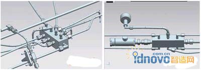 另外部件間幾何體及其空間位置關系的也得到了相應的傳遞,使得在部件間建模時以鏈接部件為限制條件進行建模,如在設計F1-1600鉆井泵潤滑系統時,就采用部件間建模。油路的布線是依附于其它已經存在的零部件,一般情況下,在其它主要零部件裝配到位的狀況下,在有限的空間內進行布線并且與這些零部件連接。下圖左圖是潤滑系統及所鏈接的幾何體,右圖是完成后的潤滑油路系統。