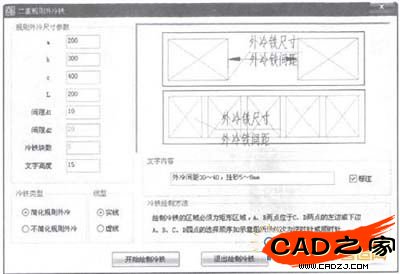 根據(jù)二重鑄造廠大型鑄鋼件的鑄造工藝要求,將冷鐵系統(tǒng)分為規(guī)則外冷鐵、不規(guī)則外冷鐵和內(nèi)冷鐵3種。以規(guī)則外冷鐵為例,先依據(jù)激冷區(qū)的鑄鋼件的結(jié)構(gòu),計算出所需的外冷鐵的尺寸、塊數(shù)和擺放位置,然后再在對話框中設(shè)置外冷鐵尺寸參數(shù)、塊數(shù)、線型和繪制方式。點擊“開始繪制”按鈕,用鼠標選取放置外冷鐵的矩形區(qū)域,系統(tǒng)自動按要求完成外冷鐵的繪制并自動標注。規(guī)則外冷鐵設(shè)計界面如圖4所示。