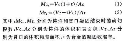 普通鑄鋼件的冒口尺寸設(shè)計一般采用普通模數(shù)法計算,取冒口模數(shù)Mr=(1.1~1.2)Mc(鑄件模數(shù)),并由補縮效率η=14%~20%來驗證。為了確保大型鑄鋼件的質(zhì)量,Mr往往要取上限,但這樣可能會造成相當大的浪費。故在二次開發(fā)中對于大型鑄鋼件采用動態(tài)模數(shù)法:在冒口一鑄件凝固體系中,冒口不斷地向鑄件補縮,使得Mr和Mc處于動態(tài)變化狀態(tài)。當鑄件凝固結(jié)束時,鑄件的實際體積增加到Vc+εVc,冒口的殘余體積減少到Vc-εVc。因此,這時它們的確切模數(shù)分別為: