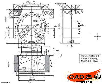大型鑄鋼件多為單批或小批生產(chǎn),且制作冒口需花費大量的木材和工時。所以二重鑄造廠將冒口尺寸進行標準化和系列化,這樣就可以充分的發(fā)揮冒口模型的使用價值,節(jié)省大量的人力,物力。在用鑄造工藝CAD系統(tǒng)繪制冒口時,我們根據(jù)大型鑄鋼件的結(jié)構(gòu)和工藝流程,確定冒口的尺寸和類型,點擊所需類型的冒口圖標,以圓形明冒口為例,在編輯框中輸入冒口的尺寸參數(shù)、視圖類型及冒口線型,并根據(jù)需要計算出冒口重量和冒口模數(shù)。參數(shù)設(shè)置完畢后,點擊“開始繪制冒口”按鈕,進入冒口繪制階段,此時,工藝人員用鼠標選取冒口放置平面及方向,系統(tǒng)自動生成冒口的3種視圖,并自動標注尺寸。圓形明冒口設(shè)計界面如圖2所示。