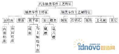 由于基于特征來定義產(chǎn)品模型有很多優(yōu)點,所以為大多數(shù)技術(shù)研究工作者所接受,它的優(yōu)點就是,通過特征來定義模型,可以使復(fù)雜的形體簡化為有限的可以供識別處理的型面,例如,汽車軸類零件上有很多型面是不規(guī)則的,所以,我們可以簡化為可以被處理的特征的組合,通過簡化,汽車軸的特征型面主要可概括為內(nèi)圓柱面、外圓柱面、軸肩、鍵槽、平面、倒角等,筆者就用這些基本特征來定義工藝特征模型,經(jīng)研究,汽車軸類零件的特征定義可以如下劃分和歸類如圖1所示。