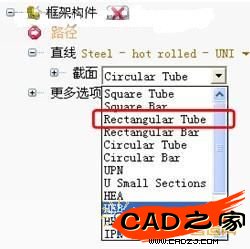 選擇圖1中上部四條邊作為第一個路徑,在該路徑上我們將使用相同的構件。打開“直線”/“截面”下拉列表,可看見ThinkDesign2009提供了許多預置構件,如圖1-3所示。選擇“Rectangular Tube”我們將添加一矩形截面管材。