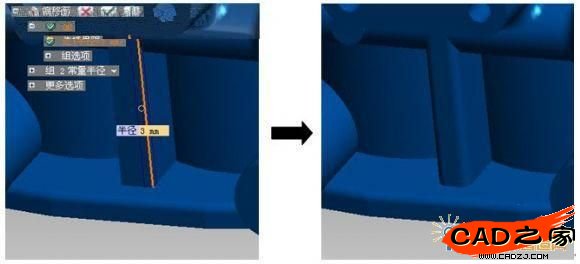 啟動實體建模命令“倒圓角”,選擇立筋的兩側棱線,重新添加圓角特征。整個過程及處理前后的變化如圖3-5所示,這便完成了對一個新特征的添加。