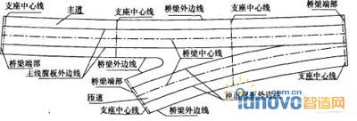 考慮到在實(shí)際生產(chǎn)中,橋梁設(shè)計(jì)是在路線(xiàn)設(shè)計(jì)提供的路線(xiàn)框架成果圖基礎(chǔ)上,截取橋梁設(shè)計(jì)所需的基本路線(xiàn)設(shè)計(jì)參數(shù)(如橋梁的起終點(diǎn)樁號(hào)、橋梁的平縱面外邊線(xiàn)等基本設(shè)計(jì)參數(shù))而進(jìn)行的,而腹板邊線(xiàn)則是通過(guò)橋梁外邊線(xiàn)偏移得到的。所以系統(tǒng)提供交互的方式讓用戶(hù)手動(dòng)采集橋梁中心線(xiàn)、橋梁邊線(xiàn)、腹板邊線(xiàn)與腹板中心線(xiàn)、橋梁支座中心線(xiàn),根據(jù)支座中心線(xiàn)自動(dòng)實(shí)現(xiàn)橋梁的分跨及跨長(zhǎng)計(jì)算;同時(shí)把交互拾取得到的橋梁基礎(chǔ)信息保存到數(shù)據(jù)庫(kù),以便橋梁后續(xù)設(shè)計(jì)調(diào)用。圖2以“卜型”箱梁平面為例說(shuō)明系統(tǒng)拾取要點(diǎn),其中主道、匝道的橋梁平面信息分別拾取。