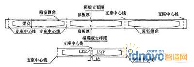 箱梁立面設(shè)計(jì)主要包括梁高、頂/底板厚度、各跨箱竄立面倒角等參數(shù)設(shè)計(jì)(如圖5所示),而橫隔板設(shè)計(jì),由于橋梁平縱設(shè)計(jì)相互關(guān)聯(lián),繪制立面圖時(shí)需讀取平面設(shè)計(jì)時(shí)保存的跨長(zhǎng)、橫隔梁厚度等。
