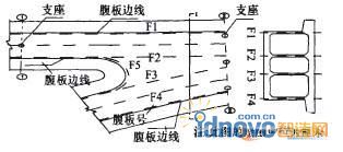 由于互通立交曲線(xiàn)箱梁橋通常存在不等跨分布的情況,所以系統(tǒng)在進(jìn)行平面圖設(shè)計(jì)及繪制時(shí)要以跨為單元,分別進(jìn)行設(shè)計(jì)及繪制。箱梁平面圖設(shè)計(jì)主要包括腹板寬度、橫隔板厚度、腹板變寬段的長(zhǎng)度及腹板加寬段的長(zhǎng)度等(如圖3所示)。