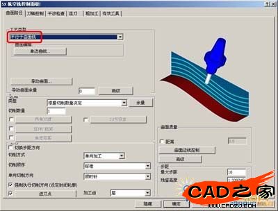 進入“5X航空銑控制面板”,“曲面路徑 ”中“工藝類型”選擇“平行于曲面銑”。