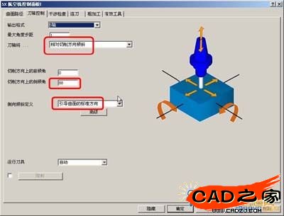 在5X航空銑控制面板中“刀軸控制”頁面設置“刀軸將”“相對切削方向傾斜”及相關參數如下:
