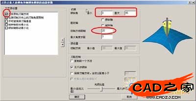 設置最大值為45。勾選“保持原始刀軸方向”并設置“初始方向限制”為20。