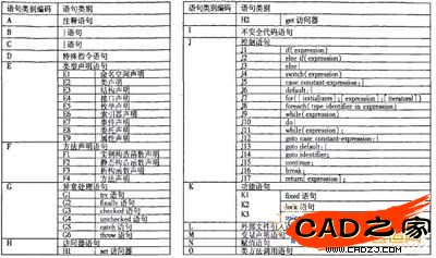依據Microsoft Visual Studio.NET 2003文檔,深入研究c#的語法規范及特點,遵循C#語法定義的命令語句的原則——可單個執行的命令,針對源代碼逆向分析獲取信息的需求,自定義了一套命令行語句規則,其分類編碼如圖l所示。