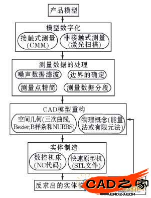 目前,逆向工程研究(Reverse Engineering,RE)受到越來越多的重視。逆向工程技術是從測量過程開始,通過檢測實體的曲面輪廓、應用CAD幾何造型技術來構造曲面模型。該研究是分析逆向工程的實施條件和應用領域,論述逆向工程軟件和商業化CAD/CAM軟件的特點,實現多樣性和創新性的設計,其開發過程主要包括:用測量系統獲得數據點并重構其CAD模型;對構造的CAD模型進行輪廓形狀測試和驗證;通過模具、雕塑曲面,CNC加工和快速原型法重構逆向工程的實體模型。產品的開發流程如圖1所示。