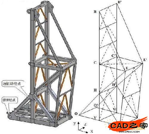 例子中的斗輪堆取料機屬于整體液壓俯仰式機型,即整個上部鋼結構和配重通過液壓油缸伸縮實現俯仰動作,以滿足不同高度料堆的堆取工作。整個上部俯仰結構是通過兩個俯仰主鉸點和兩個油缸動鉸點支承的,油缸鉸點的移動實現俯仰動作。從圖中可以看出,斗輪機構、懸臂膠帶機、懸臂架、配重架、拉桿、附屬結構等零部件的重量和載荷都直接或者間接的作用在塔架上,因此,塔架在整個設備中受力復雜,需要合理設計和準確計算。
