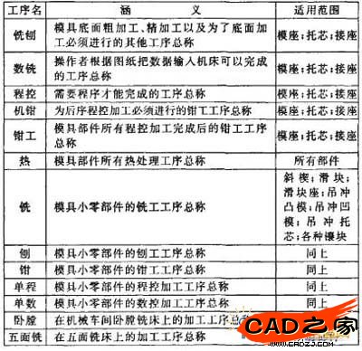 模具加工部位標(biāo)準(zhǔn)名稱的確定為制定標(biāo)準(zhǔn)加工工序名奠定了基礎(chǔ)。根據(jù)現(xiàn)有的生產(chǎn)設(shè)備及多年經(jīng)驗(yàn),制定出了合適的標(biāo)準(zhǔn)加工工序名。在標(biāo)準(zhǔn)工序名中規(guī)定其適用范圍、基本涵義。標(biāo)準(zhǔn)工序名的具體內(nèi)容見表1。