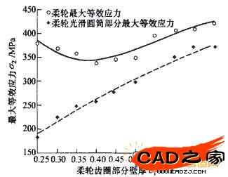 圖7 柔輪光滑圓筒壁厚對柔輪應力影響曲線