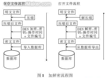 ⑴保存文件流程:①壓縮明文文件,即壓縮過的文件較小,可以顯著提高加密的效率;②使用DES算法加密壓縮過的文件,即密鑰采用文件導入數據庫時的時間+文件ID號后打亂字節順序;③將加密后的壓縮文件導入數據庫大字段。