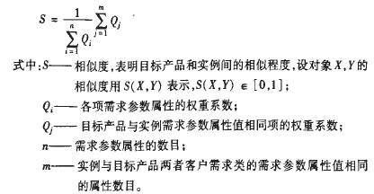 在產(chǎn)品實例庫中檢索相應產(chǎn)品族的產(chǎn)品實例,按照相似度的數(shù)學計算模型.把此實例的客戶需求類對象與目標產(chǎn)品的客戶需求類對象間的需求參數(shù)屬性值進行相似度計算,得出最相似的產(chǎn)品實例,其中相似度計算的數(shù)學模型: