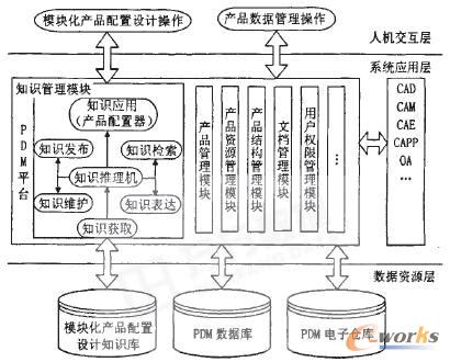 (2)系統(tǒng)應用層是PDM系統(tǒng)和其他系統(tǒng)(如CAD/CAPP/CAE/CAM/OA等)應用集成。其中主要是PDM模塊功能的應用,這些模塊包括模塊化產(chǎn)品配置設計知識管理模塊和其他核心功能模塊(產(chǎn)品資源管理模塊、產(chǎn)品管理模塊、產(chǎn)品結構管理模塊、文檔管理模塊、工作流程管理模塊和用戶權限管理模塊等)。