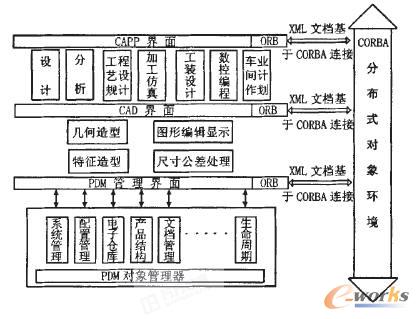 采用CORBA的ORB作為該集成框架的“軟件總線CAD/CAPP/PDM等應用程序只要給出用IDL語言書寫的界面,即可插到ORB上而實現與其他對象的互操作各個異構數據源和服務也被封裝成對象,其界面亦用IDL語言進行描述。不同的ORB之間則通過HOP協議進行通訊。