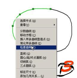 選擇樣條曲線并右擊,在彈出的快捷菜單中,可以使用“插入樣條曲線型值點(diǎn)”、“移動方框”、“檢查曲率”等一系列的工具控制樣條曲線的形狀(如圖2 所示):