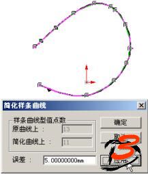 通過指定樣條曲線型值點(diǎn)之間的距離差,可以規(guī)律地減少型質(zhì)點(diǎn)的數(shù)量,從而達(dá)到簡化樣條曲線的目的。如圖4 所時(shí),在誤差文本框中輸入型值點(diǎn)間距誤差,就可以將樣條曲線上型值點(diǎn)距離小于5mm 的點(diǎn)刪除。