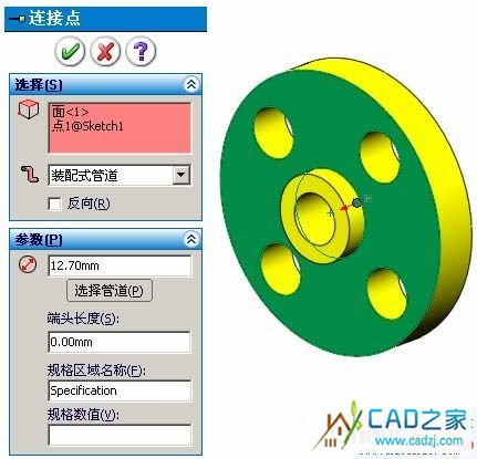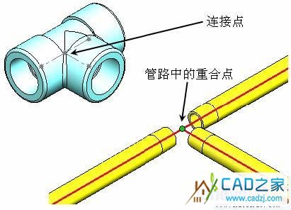 連接點(diǎn)是管路附件零件中的一個(gè)點(diǎn)。連接點(diǎn)定義了管道的起點(diǎn)或結(jié)束點(diǎn),接頭零件的每個(gè)端口必須有一個(gè)連接點(diǎn)。建立管道系統(tǒng)時(shí),必須從現(xiàn)有裝配體中零件上的一個(gè)連接點(diǎn)開始。