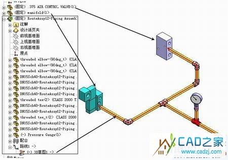 一般說來,管路附件是指管路系統(tǒng)中應(yīng)用的標(biāo)準(zhǔn)附件,例如彎頭、三通、接頭、管帽或法蘭等標(biāo)準(zhǔn)零件。系統(tǒng)在利用3D 草圖建立管道系統(tǒng)時(shí),可以直接應(yīng)用不同形式的彎頭;而對(duì)于三通或法蘭類型的附件,需要用戶自行添加。