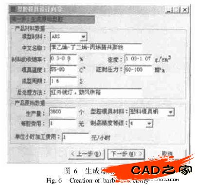 (3)模具設計向導第二步(圖6):輸入產品基本信息,提取材料信息:包括生產量、模具精度、模具材料等,生成模具原始型腔.