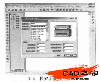 開發建立與CAD系統配套的標準件庫和模架標準庫,是智能模具CAD設計的重要內容之一.標準件庫的實用界面如圖3所示.模架庫涉及的類型和零件比較多,調用的數據庫復雜,由于是裝配體,其中零件屬性的驅動具有很大的代表性,其驅動連接過程體現了整個注塑模具CAD設計過程中的智能信息的傳遞和提取.圖4為D2M2E模架選用過程系統運行的界面效果.