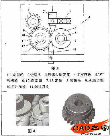 SolidWorks是一套較好的三維造型軟件,零件實體建模功能較強大,其摹本建模特征有:拉伸凸臺/切除、旋轉凸臺/切除、掃描凸臺/切除、放樣凸臺/切除、以及曲面造型等,為設計師們提供了其優秀的設計環境。模型如圖3、圖4所示,錫絲打孔機的結構由主支撐板、電機主動齒輪、齒輪刀片組件(此組件由從動齒輪、鋸齒形刀片、刀片壓板組成,如圖5)、副從動輪、進錫頭、進錫頭支撐架、出錫頭等組成。